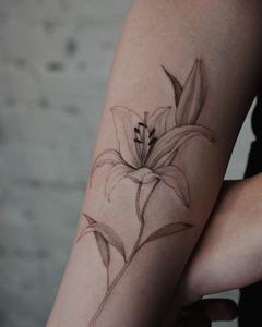 Предпочитает технику деликатных линий и растушевки, использует черный/серый цвет и работает самыми тонкими иглами 1RL.