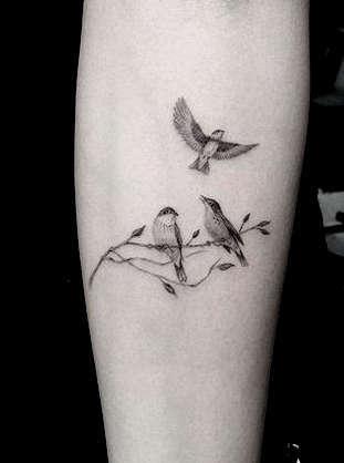 Татуировки маленьких птиц могут быть силуэтами разлетающихся красивой стаей черных птиц на запястье, предплечье, плече, в эскизе с тонкой работой птичьего пера, на ступне, голени разлетающейся из одуванчика - чтобы выразить свободу, освобождение ума от негативных мыслей, преград на вашем пути.