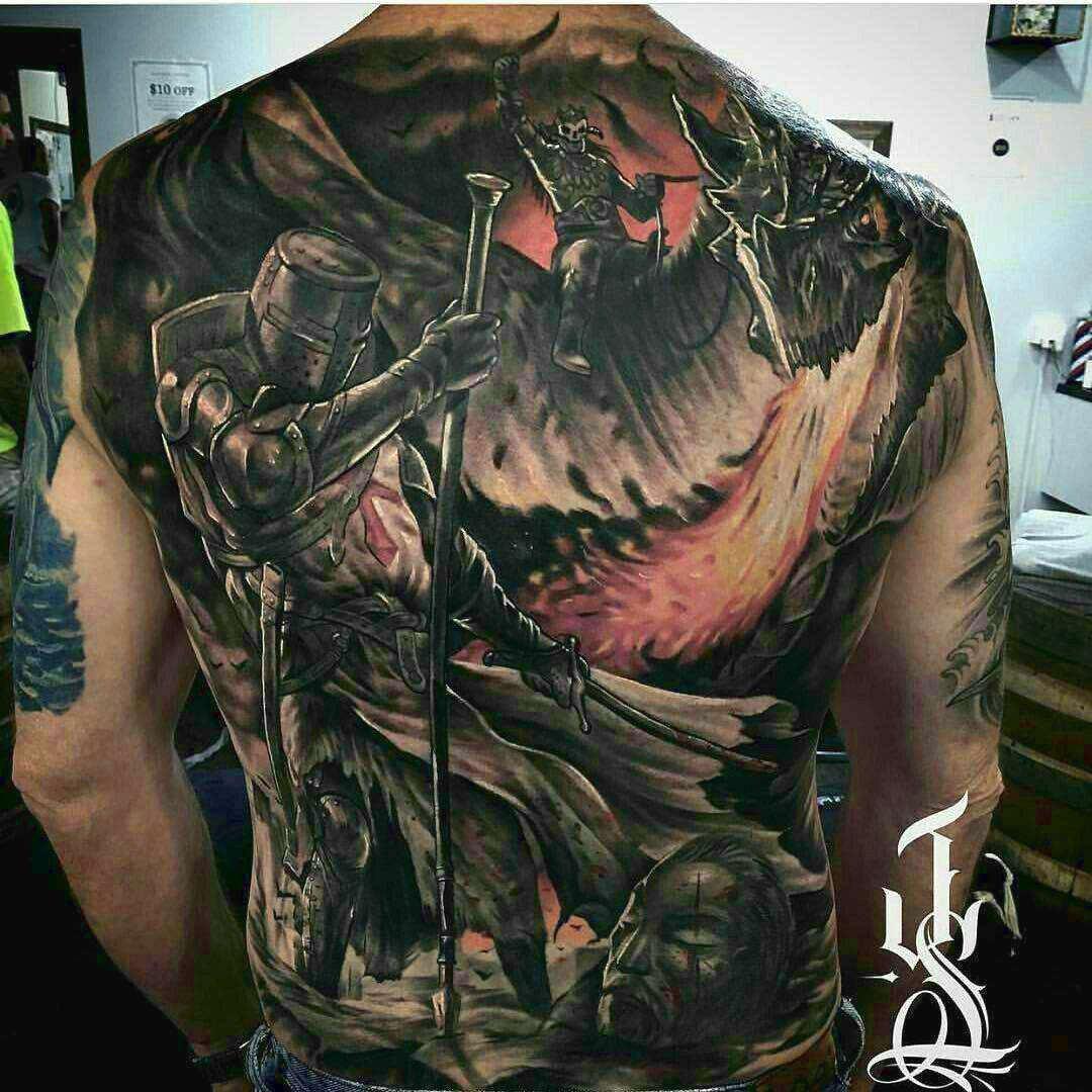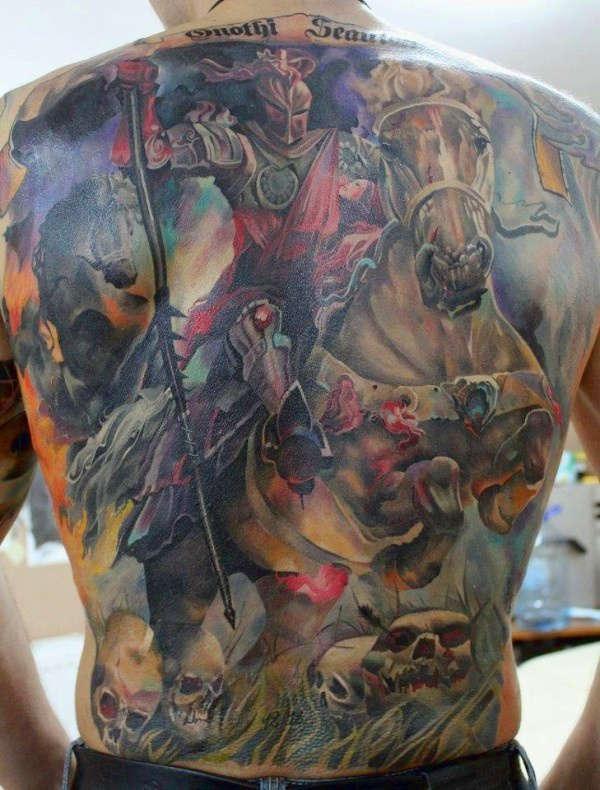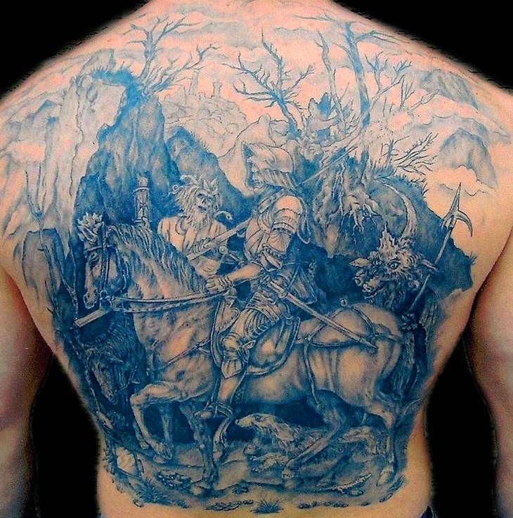 Дюрера на создание гравюры, возможно, вдохновила книга голландского гуманиста и богослова Эразма «Руководство христианского солдата»(1501 год) и конная статуя Бартоломео Коллеони, которая была создана итальянским скульптором Андреа дель Верроккьо: змееголовая тату смерть и козлоголового тату дьявола здесь сами говорят за себя, сияющие доспехи тату рыцаря означают его твердую христианскую веру, песочные часы в руке тату Смерти представляют отмеренное время жизни человека, тату хвост лисы на копье рыцаря символизирует побеждённого лукавого, тату собака рыцаря воплощение правды и преданности, снующие тату ящерицы и тату череп под капытами лошади намекают на опасности и смерть предшественников. Татуировки рыцарей, всадников апокалипсиса, тату паладинов, воинов тамплиеров про пути мира, их неисповедимость, ясную мысль и праведный труд человека, про то, что мы помогаем мостить эти, непостижимые для нас, пути Мужчины. Хорхе Луис Борхес написал 2 стихотворения в по мотивам гравюры (дополнительный ):