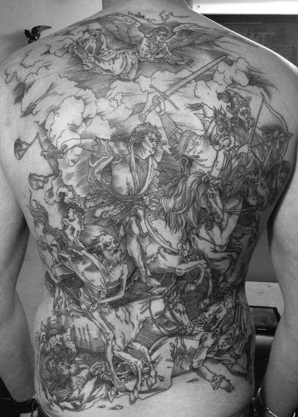Альбрехт Дюрер свою гравюру «Рыцарь, Смерть и Дьявол» назвал сначала «Всадник». Техника гравюры наиболее близка искусству татуировки, художник процарапывет резцом канавки на листе меди, а затем заливются в них чернила.
