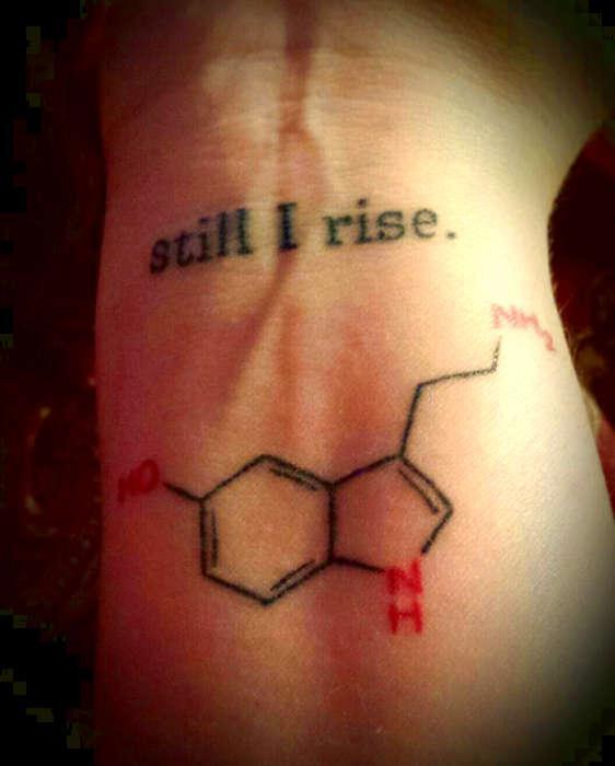 Ваш знак татуировки эмоции, чтобы напомнить себе, что происходящее не моя вина в борьбе с чувством универсальной ответственности, приступах страха, аутоагрессии (наказания человеком самого себя за происходящее) и защиты от этой внутренней агрессии. Серотонин участвует в регуляции настроения, чувства тревоги и при нехватке серотонина в организме можно смотреть на тату формулы серотонина, восстанавливая его расстройство естественной выработки. При расстройствах пищевого поведения, тревожности, биполярном расстройстве внезапных смен настроений татуировка эмоции напомнит себе что это временное состояние и его надо «продышать», пережить, переждать момент и идти, жить дальше, радуясь умению владеть собой при общении.