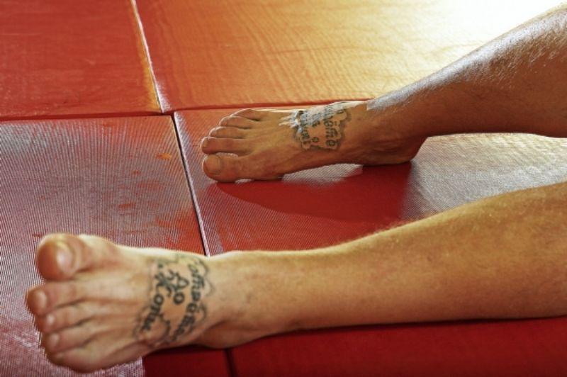 «Пойдете за правдой, сотретесь до жопы»-надписи на стопах ног - типично уголовная примочка. Удивительно, что на ногах Александра Емельяненко появилась именно эта фраза, а, например, не другая, тоже довольно распространенная - «наступи менту на горло».