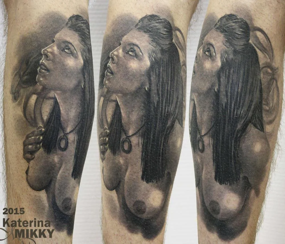 Тату портрет девушки на голени