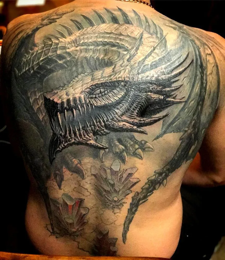 Тату дракон с кристаллами киберпанк на спине