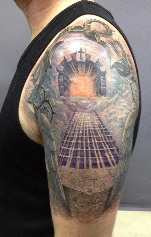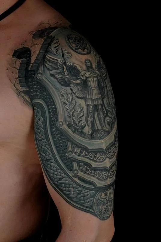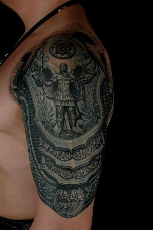 Тату Архангела Михаила с пылающим мечом и звездой в камне и железе на плече