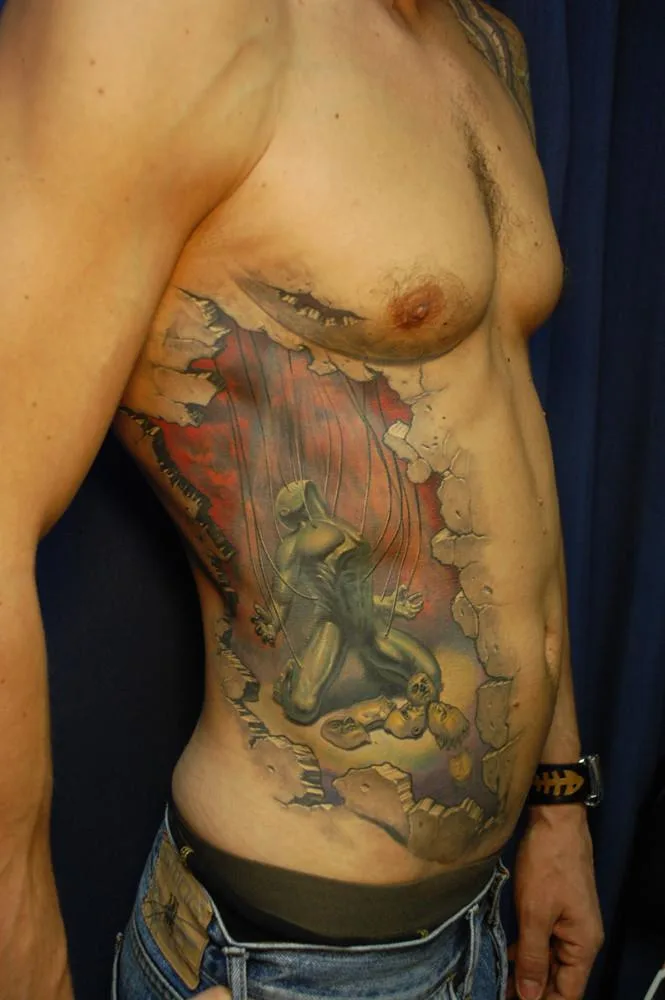 Тату личина сбрасывает маски в камне на боку