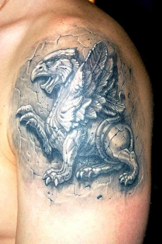 Тату грифон в камне на плече