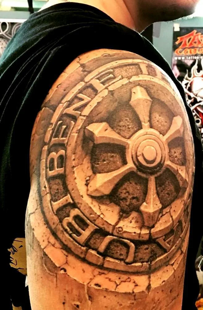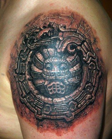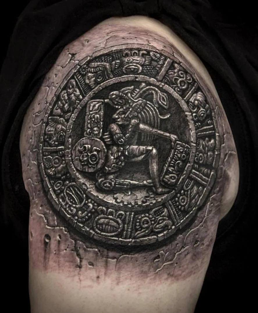 Тату майя круглый зодиак в камне на плече