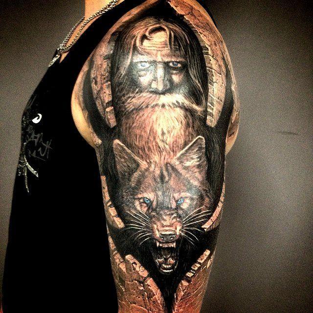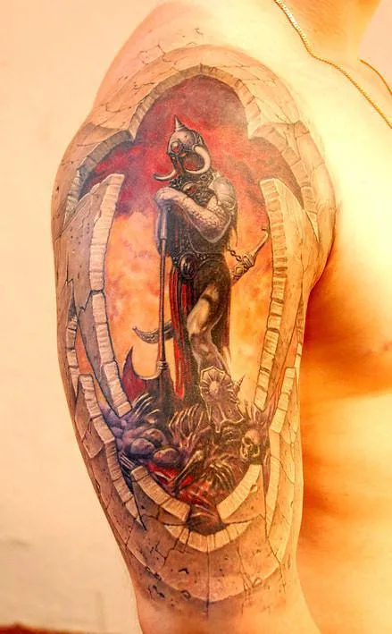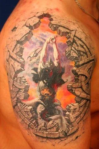 Тату викинг в огне после сражения со скандом в камне на плече