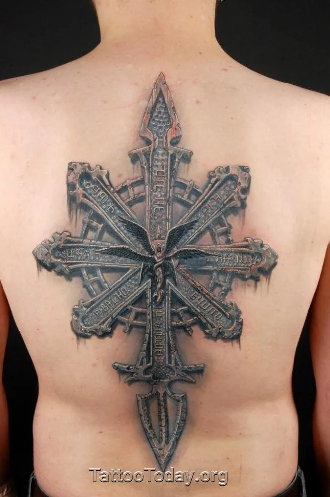 Тату коловрат с шестикрылым Серафимом камень и железо на спине