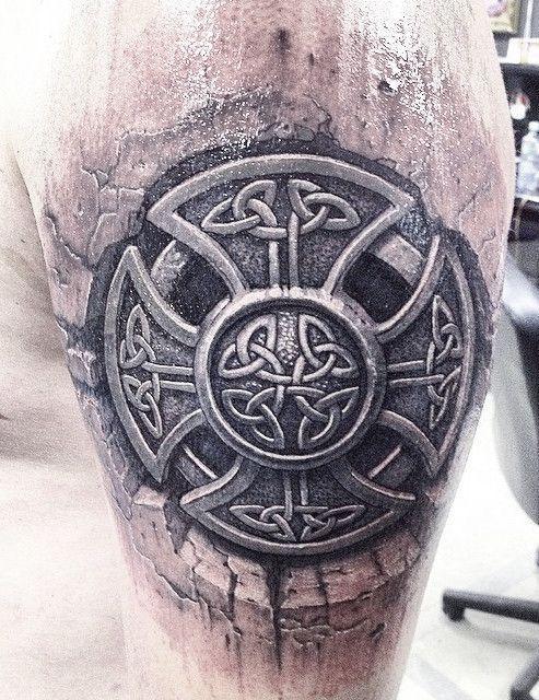 Тату кельтский крест языческий в камне на плече