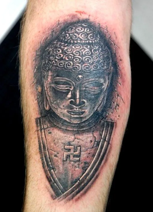 Тату Будда и свастика посолонь созидающая в камне на руке