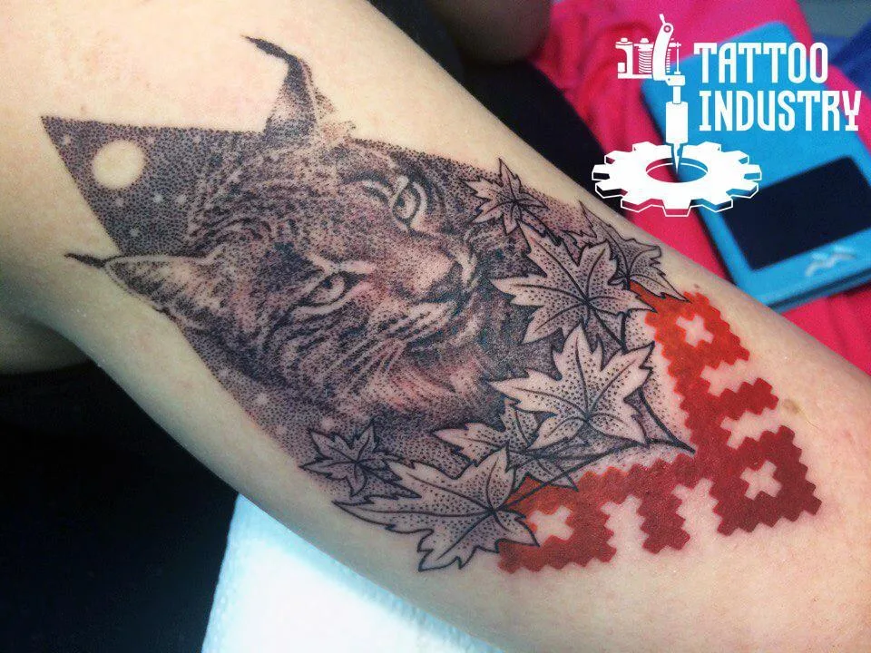 Тату рысь дотворк славянский орнамент на плече девушки