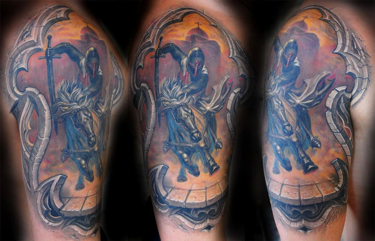 Тату рыцарь меченосец тамплиер в шлеме на коне плечо