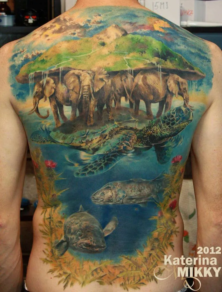 Тату на спине земля на слонах и черепахе