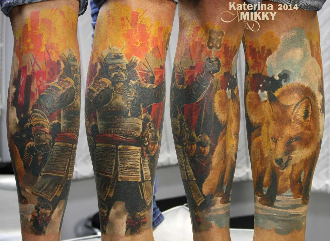 Тату на голени лиса и самурай