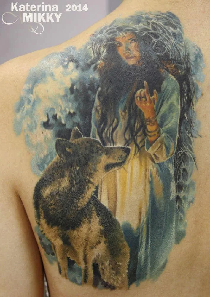Татуировка девушка и волк