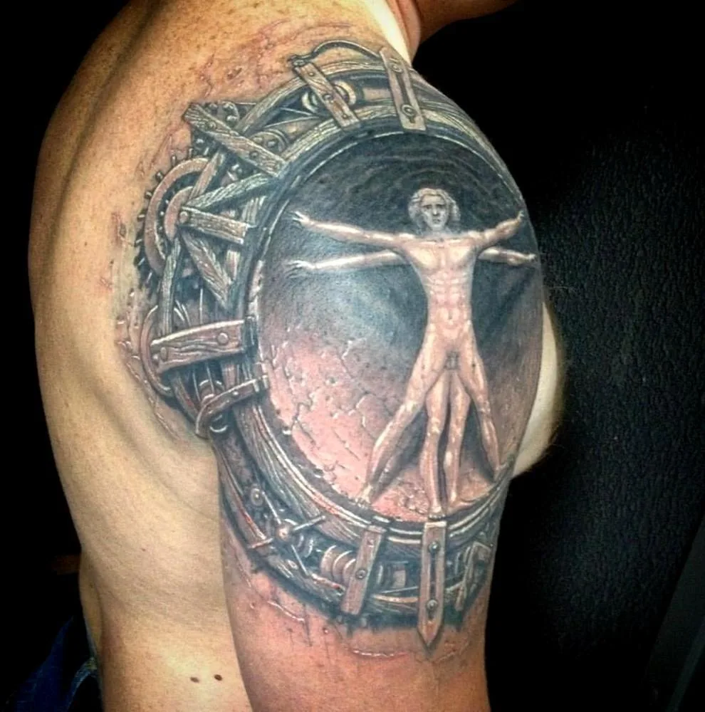 Тату Человек Леонардо да Винчи стимпанк винтаж камень на плече