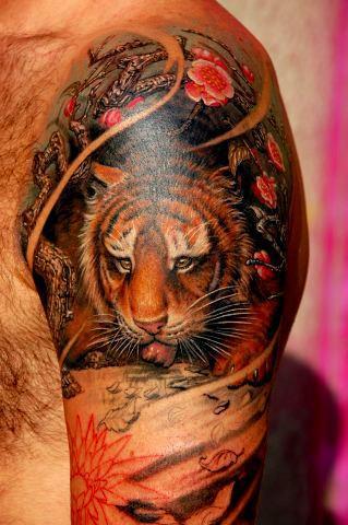 Тату тигр на плече затаился