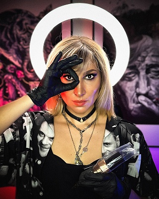 Работаю в реалистичной графике с яркими образами и характерами. Основная техника - випшейдинг (напыление) самыми тонкими иголками. Люблю сочетать милое с дерзким и реалистичное с абстрактным. Зернистые текстуры - особая